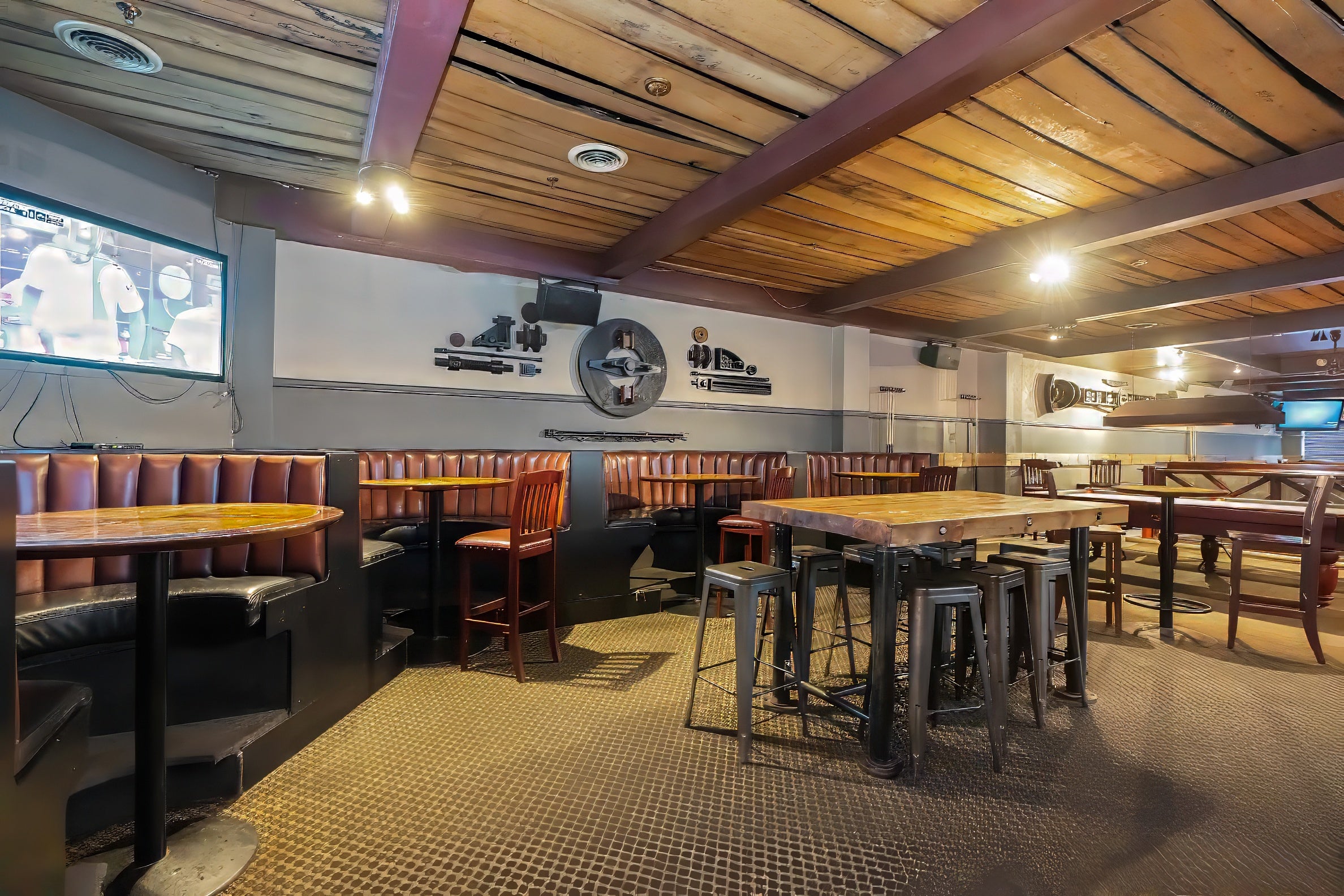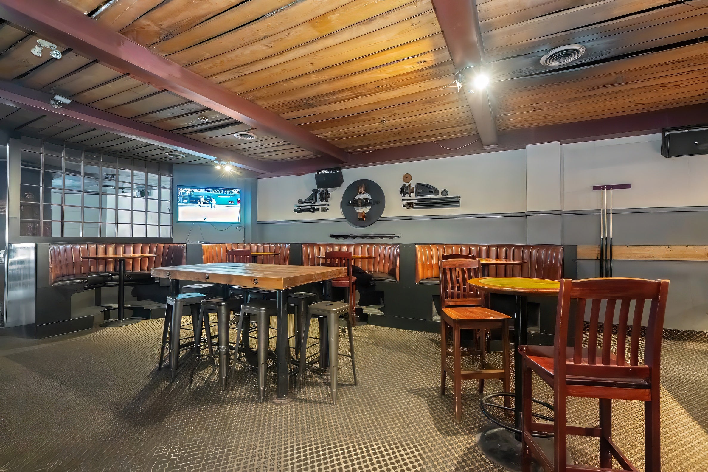 a lively and versatile space perfect for mingling and casual gatherings. With a standing capacity of up to 70 guests, it features pool tables for entertainment, a rustic harvest table for shared bites, and cozy booths for smaller groups.